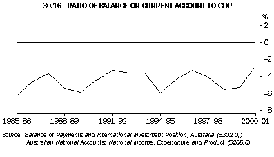 Table 30.15 and graph 30.16 show that the ratio of the current account deficit to GDP was 2.8% in 2000-01, down significantly on the previous year, and well below the average for the last ten years (4.2%).