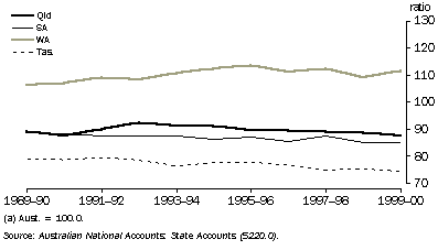 An important use of State accounts is to compare the performance of each State and Territory. Graph 29.21 shows the ratio of GSP, in current prices, per head of mean population for each State and Territory to the Australian value (GDP per head of mean population) since 1989-90. For New South Wales, Victoria, Western Australia, the Northern Territory and the Australian Capital Territory, GSP per head of mean population has been above the national average. For Queensland, South Australia and Tasmania, GSP per head of mean population has been below the national average.