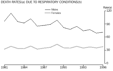 To allow comparison over time, annual death rates have been age standardised to the total Australian population as at 30 June 1991. Between 1981 and 1996, standardised death rates for respiratory conditions showed considerable fluctuation. The male rate was consistently higher than the female rate. However, since 1981, the difference between the male and female rates has narrowed. This is due mostly to a decline in the male rate, which decreased from approximately three times the female rate in 1981 (96.4 per 100,000 population compared with 32.5) to about twice the female rate in 1996 (71.1 compared with 38.1).