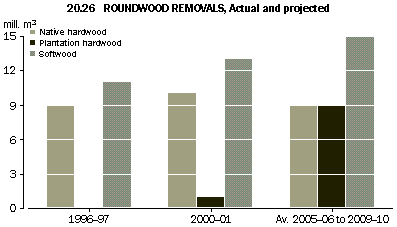 In the past decade, reduced availability of hardwood sawlogs and increased availability of softwood sawlogs and pulpwood resulted in significant changes in the relative prices of these production inputs, and consequently in the production mix of structural wood products and their prices to consumers. Sawn hardwood prices rose strongly relative to sawn softwood- and pulpwood-based products such as wood-based panels (graph 20.23). With these trends projected to continue throughout the current decade, sawn hardwood consumption is projected to decline from 1.2 million cubic metres in 2000-01 to 1.0 million cubic metres in 2006-07, while sawn softwood consumption is projected to rise from 2.9 million to 3.7 million cubic metres. Consumption of wood-based panels and reconstituted wood products is also projected to rise in the medium term, from 1.5 million cubic metres in 2000-01 to 1.7 million cubic metres in 2006-07 (graph 20.24). The projected lower rate of increase in consumption of wood-based panels and reconstituted wood products relative to that of sawn softwood reflects expectations that higher sawn softwood production will increase the availability of low-priced soft sawnwood, and that, while reconstituted structural wood products will remain competitively priced, their use will continue to be constrained to niche markets by building preferences. Structural wood production Australia produced 5.3 million cubic metres of structural wood in 2000-01, consisting of 1.2 million cubic metres of sawn hardwood, 2.3 million cubic metres of sawn softwood and 1.8 million cubic metres of wood-based panels (graph 20.25). The average recovery rate (the ratio of sawnwood produced to the volume of sawlogs milled) is estimated to be around 40% from plantation sourced softwood logs and 33% from native forest sourced hardwood logs. Production of wood-based panels includes reconstituted structural wood products that are direct substitutes for sawn timber, such as laminated veneer lumber and composite beams. If all of the sawlog component of the industrial roundwood supply projected for the period 2005-06 to 2009-10 were to be processed into sawn timber, then reduced hardwood sawlog availability from native forests could result in annual sawn hardwood production falling by around 15-20% to average 1.0 million cubic metres, and sawn softwood production rising by around 60-70% to average 4.1 million cubic metres a year. The increased supply of pulpwood directly and as mill residue could also reduce the cost of producing wood-based panels and reconstituted structural products, the combined production of which could potentially average 2.2 million cubic metres a year in the period 2005-06 to 2009-10 (see graph 20.25). Structural wood imports and exports There has been a long-term decline in the share of imports in structural wood consumption, as domestically produced sawn softwood has become more competitive with imports. At the same time, the share of wood-based panels imports in total wood-based panels consumption has been rising, reflecting the availability of low cost imported wood-based panels and reconstituted structural wood products. Future trends in Australian trade in soft sawnwood (both imports and exports) will depend largely on the international competitiveness of softwood processing in Australia. Although the share of sawn softwood imports in Australian sawn softwood consumption is expected to continue to decline, it is expected that imported special applications timbers such as Douglas fir and western red cedar will continue to hold around 10-15% of the market. In the reconstituted structural wood market, imports represent a high share of total consumption and are likely to continue to do so, as the size of the mills required for economic production of many of these products exceeds the likely requirements of Australia's relatively small domestic market. While some of the projected additional sawn softwood production (see next section) is likely to be absorbed by the domestic market (probably at lower prices), a large proportion would be available for export. However, the ability to export sawn softwood will depend on Australia's international competitiveness in Pacific Rim markets. To compete, Australian sawmillers will need to be able to produce and transport sawn softwood to export markets at a lower cost than competing nations. This may prove increasingly difficult as sawn softwood from plantations in other nations such as Argentina and New Zealand also comes on stream in the latter half of the current decade. Plantations and structural wood markets Forest plantations have provided progressively more of Australia's structural wood resources in recent years. Some recent revisions to projected wood supplies from both forest plantations and native forest, however, suggest that this process is occurring more quickly than previously expected. It is now possible that forest plantations could be providing 75% of domestic industrial wood supplies by 2010, compared with expectations of only around 62% several years ago. The forecast net increase in wood flow is also much larger than previously expected - at around 5.5 million cubic metres - after expected decreases in flows from native forest are taken into account. The potential increase in plantation wood supplies will have many implications for Australia's wood and paper industries. If all of the sawlog component of the industrial roundwood supply projected for the period 2005-06 to 2009-10 were to be processed into sawn timber, then sawn hardwood production in Australia would fall by 15-20% and sawn softwood production would rise by 60-70% relative to current levels. This would represent a significant addition to domestic sawn softwood availability. The issues relating to the potential to export the increased stock of sawn softwood that is not required for domestic consumption were discussed in the previous section. Large increases in domestic pro