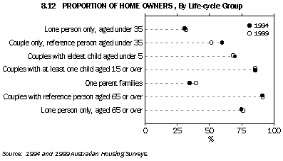 Between 1994 and 1999, the home ownership rates of various life-cycle groups showed little change. However, there were two exceptions. For young couple households without children, home ownership fell from 60% in 1994 to 52% in 1999, while home ownership for lone-parent families increased over the period (from 35% to 40%).
