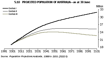 Graph 5.10 shows that Australia's population is projected to grow from 19 million in 1999 to around 19.4 million in 2001 and between 24.1 and 28.2 million in 2051. By 2101 the population is projected to rise to between 22.6 and 31.9 million. The rate of population growth is projected to vary at different times during the projection period, with a clear long-term declining trend from 1.2% in 1998-99 to between 0.0% and 0.4% by 2050-51 and to between -0.1% and 0.2% by 2100-01. The reason for this slowing in growth is mainly a projected decline in the natural increase (births minus deaths) of the population. This decline is largely a result of the increasing number of deaths occurring in a rapidly ageing population as well as the low and declining fertility.