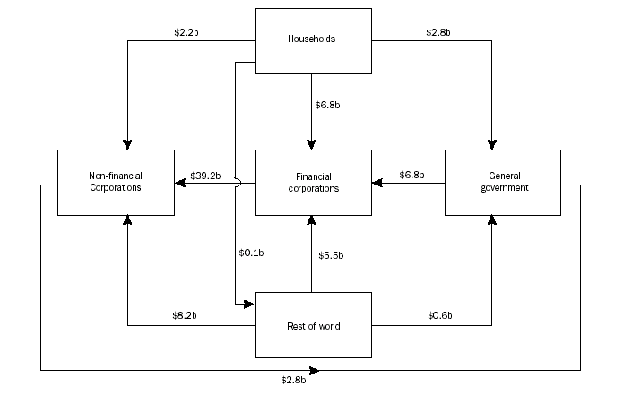 Diagram 26.1 provides an overview of the flows of capital through the financial system and summarises the end result of applying the current statistical framework. It illustrates the net financial flows between sectors during the year 2000-01. The arrows show the net flow from lenders to borrowers. For example, there is a $6.8b net flow from households to the financial corporations sector. There is also an $39.2b net flow from financial corporations to non-financial corporations. This is mainly attributable to increased loans by financial intermediaries and increased share purchases by financial institutions such as life offices.