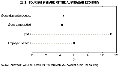 International visitors consumed $12.8b worth of goods and services, or 11.2% of total export earnings in 1997-98. Only the mining (35%), manufacturing (23%) and agriculture (20%) industries contributed larger shares.