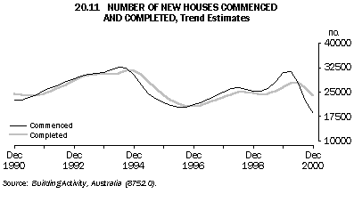 Table 20.12 shows that new house commencements are the major component of residential building activity. In 2000 new houses accounted for 70% of new residential dwelling units commenced (i.e. excluding approvals for conversions). This proportion is similar for approvals and completions.