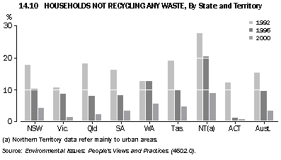 Only a small proportion of households (around 3%) in Australia recycled no waste items at all in 2000; this proportion has fallen in every State and Territory since 1992 (graph 14.10).