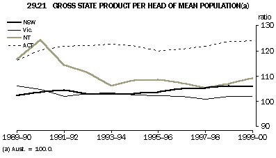 An important use of State accounts is to compare the performance of each State and Territory. Graph 29.21 shows the ratio of GSP, in current prices, per head of mean population for each State and Territory to the Australian value (GDP per head of mean population) since 1989-90. For New South Wales, Victoria, Western Australia, the Northern Territory and the Australian Capital Territory, GSP per head of mean population has been above the national average. For Queensland, South Australia and Tasmania, GSP per head of mean population has been below the national average.