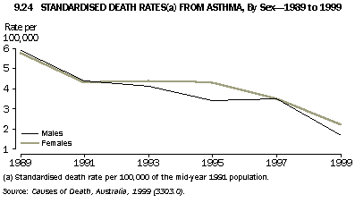 The 1995 National Health Survey estimated that 11.3% of Australians (2.04 million people) had asthma, generally as a long-term condition. This represents an increase from the prevalence in 1989-90 National Health Survey, which estimated that 8.5% of Australians had the condition. According to the Bettering the Evaluation and Care of Health (BEACH) survey, asthma is the sixth most frequently managed problem by general practitioners, accounting for 32 of every 1,000 encounters (AIHW General Practice Statistics and Classification Unit 1999). Asthma is also one of the top five reasons for doctors referring patients to hospital. During 1997-98, asthma was the principal diagnosis in 60,280 hospital separations (1.1% of all hospital separations), with an average stay of 3.5 days. The number of hospital separations increases substantially to 251,470 (or 4.5% of all separations) if both principal and additional diagnoses of asthma are included. Mortality Asthma accounted for 0.3% of deaths in Australia in 1999, when 160 males and 264 females died from the disease. As graph 9.24 shows, between 1989 and 1999 the standardised death rates due to asthma declined for males (from 5.9 to 1.7 per 100,000) and females (from 5.8 to 2.2 per 100,000). In 1999 death rates were highest for those aged 65 years and over for both males and females.