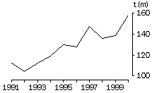 Exports of Meat of bovine animals (SITC 011), predominantly beef, dropped from 1993 to 1996 by 35% to $2,069 million. This decrease reflected growing competition from the USA, leading to lower prices for Australia's exports, as well as an appreciating Australian dollar. In the past four years the level of exports has improved. The reduction in US cow slaughterings and increased US prices of manufactured beef led to a greater demand for Australian beef from Japan and the USA, our major beef export markets. The weaker Australian dollar also contributed to the rise in the value of exports in the last year. WHEAT