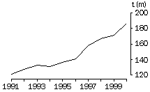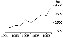 Passenger motor vehicles (SITC 781) has been the most significant import group, by value, since 1992. In 2000 it accounted for 6.7% of Australia's total imports, compared with 4.5% in 1991. Japan has remained Australia's major source of imported passenger motor vehicles over the decade, but its share of the market declined from 83% in 1991 to 60% in 2000. Germany and Korea increased their market shares over the decade. The increase in the value of imports of passenger motor vehicles can be attributed to a decrease in the number of domestically produced models, growth in demand for small vehicles, reduction in tariff rates for imported cars and greater competition in the passenger motor vehicle market. The slowdown in 1999 can be attributed to both the Asian economic crisis and an oversupply of foreign made passenger motor vehicles in Australia. Australia's imports of Motor vehicles for the transport of goods (SITC 782) have increased steadily over the decade, accounting for 1.7% of total imports in 1991 and 2.1% in 2000. Japan supplied 85% of these imports in 1991, but by 2000 this had decreased to 53%, with Germany and the USA increasing their market shares. Imports of Motor vehicle parts and accessories (SITC 784) similarly increased steadily over the decade. As a proportion of total trade, there was an increase from 1.7% in 1991 to 2.2% in 2000. Japan was again the main supplier contributing 51% in 1991 and 48% in 2000. AIRCRAFT Value The value of Aircraft and associated equipment (SITC 792) imports fluctuated over the decade, due to the irregular demand for and the high price of new aircraft. From 1998, there has been an increase in imports due mainly to new airlines entering the domestic market. It should be noted, that aircraft which are imported under an operational lease are not included in merchandise imports. NON-MONETARY GOLD Value The value of imports of Non-monetary gold (SITC 971) showed a significant peak in 1998 due to large imports of non-monetary gold from Asia for processing in Australia and subsequent export, one of the consequences of the Asian economic crisis. BALANCE OF TRADE The graph below shows Australia's total exports and imports over the decade, with the balance of trade (exports less imports) also included. Australia's exports increased by 106% and its imports increased by 135% over the decade. While there was a trade surplus at the beginning of the decade, for most of the decade Australia experienced a trade deficit. A weaker Australian dollar helped narrow this deficit in 2000. ABBREVIATIONS USED