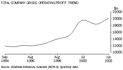 The trend estimate for total company gross operating profit, in current price terms, was relatively flat between September quarter 1994 and December quarter 1996. From March quarter 1997, the series began to increase, with growth particularly strong during 1999-2000. The estimate in June quarter 2000 ($19,587m) was 63% higher than for December 1996. The series then decreased during 2000-2001 but has begun to increase through 2001-02. The estimates for March and June quarters 2002 are slightly higher than the previous June quarter 2000 peak.