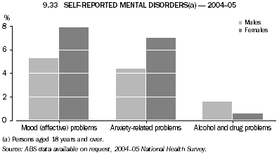 MENTAL HEALTH Most people in Australia enjoy good mental health. However, in 2004-05, approximately 2.1 million people (11% of the population) reported having a long-term mental or behavioural problem that had lasted, or was expected to last, for six months or more. Mental illness is not a major direct cause of death, but it is associated with a proportion of deaths due to suicide and some other conditions, and can lead to chronic disability. Mental ill health is one of the leading causes of non-fatal burden of disease and injury in Australia. Together, mental disorders accounted for 7.5% of allocated recurrent health system expenditure in 2000-01 (table 9.27). Morbidity In the 2004-05 NHS, information on long-term mental and behavioural problems was collected from all respondents. A long-term condition was defined as one which the respondent regarded as having lasted or was expecting to last six months or more. Respondents in the survey were not specifically asked if they had been diagnosed with any mental disorders, so the information they provided could be based on self-diagnosis rather than diagnosis by a health professional. In 2004-05, 11% of the Australian population reported that they had a long-term mental or behavioural problem. Proportionally more females (11%) than males (10%) reported these problems. The most commonly reported problems for adults (aged 18 years and over) were classified into two groups - anxiety-related problems, and mood (affective) problems such as depression and bipolar disorder. Each were reported by approximately 5% of all males and 7% of all females. In addition, around 1% of the population reported that they had a mental and behavioural disorder due to substance use (graph 9.33). CANCER Cancer is a disease of the body's cells. Normally, cells grow and reproduce in an orderly manner. Sometimes, though, abnormal cells will grow. These abnormal cells may then reproduce and spread uncontrolled throughout the body. Cancer is the term used to describe about 100 different diseases including malignant tumours, leukaemia (a disorder of the white blood cells), sarcoma of the bones, Hodgkin's disease and non-Hodgkin's lymphoma (affecting the lymph nodes) in which uncontrolled cell growth threatens the rest of the body. Cancer is a major cause of death in Australia and accounted for 5.8% of allocated recurrent health system expenditure in 2000-01 (table 9.27). Morbidity In the 2004-05 NHS, an estimated 338,300 Australians (1.7%) reported they currently had a malignant neoplasm. The AIHW Cancer Registry data shows there were 88,398 registered new cancer cases in 2001. The most common registrable cancers are the combination of cancers of the colon and rectum (12,844), breast cancer (11,886), prostate cancer (11,191), melanoma (8,885) and lung cancer (8,275). Together they accounted for 60% of all registrable new cancer cases in that year. Cancer occurs more commonly in males than females. At the incidence rates prevailing in 2001, it would be expected that one in three men, and one in four women would be diagnosed with a malignant cancer before the age of 75 years. Mortality In 2004 malignant neoplasms (cancer) accounted for 37,625 deaths (excluding deaths from non-melanocytic skin cancer), or 28% of all deaths registered (table 9.34). Of these, there were 21,127 male deaths and 16,498 female deaths. Overall, cancer of the trachea, bronchus and lung was the leading cause of cancer deaths, accounting for 19% of all cancer deaths. There were some differences in cancer death rates between males and females. Among males, the leading causes of cancer deaths were cancer of the trachea, bronchus and lung (22% of all male cancer deaths), prostate cancer (13%) and colon cancer (7%). Among females the leading causes of cancer deaths were breast cancer (16% of all female cancer deaths), cancer of the trachea, bronchus and lung (15%) and colon cancer (8%). Age-specific death rates for cancer increased markedly with age, and, in most age groups, were greater for males than for females. Mortality is influenced by the number of new cases of cancer (incidence) and the length of time lived after the initial diagnosis of cancer is made (survival). Relative survival is a measure that takes into consideration the crude survival (time between diagnosis and death) in the cancer population, and the corresponding expected survival in the general population. Expressed as a percentage, it is the cancer population that survives a specific number of years after the diagnosis divided by the general population that survives the same number of years. In the general population during 1992-97, the expected proportion of males aged 60-69 years who survive for the next five years was 91%. The observed survival rate during 1992-97 after five years for males diagnosed with lung cancer at age 60-69 years is 11%. The five-year relative survival proportion for males diagnosed with lung cancer at age 60-69 years is the ratio of these two percentages, that is 12%. By convention, the proportion of people surviving is measured at one, five and ten years after diagnosis. The periods reflect different stages of management during the life of a person diagnosed. For instance, the proportion of people surviving after one year can be a measure of the success of the interventions on the immediately detectable cancer, whereas five-year and ten-year measurements are strong indicators for remission or cure. During 1992-97 the five-year relative survival proportions for all cancers for females (63%) were higher than those for males (57%) (table 9.34). Australian five-year relative survival proportions for all cancers was ranked second behind the United States of America for both males and females when compared with other western countries for which relative survival data are available.