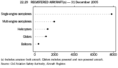 There were 12,536 aircraft in the Australian Civil Aircraft Register at 31 December 2005, including 9,787 aeroplanes and 1,291 helicopters (graph 22.29).
