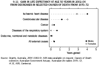 MORTALITY TRENDS OF PEOPLE AGED 50 YEARS AND OVER In 1970-72, six specific causes of death were responsible for 80% of all deaths of people aged 50 years and over. In 2002-04, these same selected causes of death were responsible for 75% of all deaths of people aged 50 years and over. However, the death rates in the latter period were generally much lower than in 1970-72 with the all-cause standardised death rate falling by around half for both males (down 51%) and females (down 48%). As would be expected, the causes of death with the highest death rates have a greater potential to contribute to improved life expectancy through their reduction than the less significant causes. Reductions in deaths from ischaemic heart disease and cerebrovascular disease (stroke) have been key to improvements in life expectancy at age 50 years in recent decades. Reductions in associated risk factors and improvements in treatment and care have been instrumental in reducing deaths from these causes. On the other hand, the small overall declines in cancer death rates for people aged 50 years and over have not translated into significant gains in life expectancy. DEATH RATES AND AGE-STANDARDISING Death rates in this article use averages of three years of deaths data for each period (i.e. 1970-72 and 2002-04) and the estimated resident population for the middle year of each period as the death rate denominator. Death rates used for comparisons of particular causes of death over time have been age-standardised. Age-standardising adjusts death rates to remove the effect of differing age structures of populations when making comparisons of death rates. The standard population used was the 2001 estimated resident population. Analysis in this article uses the concept of the underlying cause of death. Underlying causes of death are classified by the disease or injury which initiated the train of morbid events leading directly to death. Cause of death data are obtained from the ABS Causes of Deaths collection and are presented according to the International Classification of Diseases, 10th revision (ICD-10). ABS publish comparability factors to account for the introduction of the Automated Coding System in 1997 and these have been applied to the 1970-72 deaths. (End note 3) Ischaemic heart disease In 2002-04 ischaemic heart disease accounted for one-fifth (20%) of deaths of people aged 50 years and over. In 1970-72, over one-third (35%) of deaths were attributed to ischaemic heart disease. The male and female standardised death rates for ischaemic heart disease of those aged 50 years and over fell by around two-thirds (70% and 68% respectively) (graph 9.10). For males aged 50 years, the result of this decrease has been a gain of 4 years of life expectancy (just over half of the total gain in the period). Females gained 2.9 years (or 45% of the total female increase in life expectancy at age 50 years) from declines in ischaemic heart disease death rates (graph 9.11). Cerebrovascular disease Cerebrovascular disease (stroke) was responsible for 10% of deaths of people aged 50 years and over in 2002-04 and 16% in 1970-72. Over the period, death rates also decreased dramatically with declines of 70% for males and 71% for females. These were estimated to have contributed 1.1 years to male and 1.8 years to female life expectancy at age 50 years in 2002-04. Cancer Cancer was the cause of more deaths than any other selected cause for people aged 50 years and over in 2002-04 with 29% of all deaths. In 1970-72 the proportion was 17%. Compared with the other major causes of death, cancer death rates have declined relatively slowly. In the 32 years to 2002-04, the standardised death rates for people aged 50 years and over declined by only 6% for males and 4% for females. This small reduction in death rates was reflected in a minor contribution to increased life expectancy at age 50 years - around five months for males and two months for females. Males had an 18% decrease in the lung cancer death rate over the 1970-72 to 2002-04 period, contributing around three months to male life expectancy at 50 years of age. Females, on the other hand, had an increase of more than two and half times (163%) in their lung cancer death rate, equivalent to almost a three-month reduction in life expectancy for women aged 50 years. This reflects an increase in smoking rates among women in the latter third of the 20th century. Female breast cancer and colorectal cancer death rates declined by 13% and 37% respectively. Together they added around three months to life expectancy. Males also had a (17%) decline in colorectal cancer death rates, although the impact on life expectancy was less than one month. Diseases of the respiratory system Deaths from diseases of the respiratory system (mainly pneumonia and other obstructive pulmonary disease) made up 9% of all deaths in 2002-04 and 7% in 1970-72. For males aged 50 years and over, the standardised death rate for diseases of the respiratory system decreased by 46% and contributed around eight months to male life expectancy at age 50 years. Among females however, there has been no reduction in the death rate from this cause. As with lung cancer, this may also be attributed to the increase in womens' smoking prevalence in the latter part of the 20th century. Endocrine, nutritional and metabolic diseases Deaths from endocrine, nutritional and metabolic diseases (mostly diabetes mellitus) was the underlying cause of 4% of deaths for people aged 50 years and over in 2002-04 and 2% in 1970-72. Between age 50 and 79 years, males experienced a decline in the death rates for endocrine, nutritional and metabolic diseases, but this was offset by an increase in the death rate from age 80 years. Females had a similar pattern except the increase in the age-specific death rate was seen at age 85 years and over only. The impact on life expectancy at age 50 years for males was negligible, and only around two months for f
