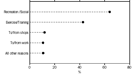INTRODUCTION CYCLISTS BY STATISTICAL REGION FREQUENCY OF CYCLING An estimated 37.4% of cyclists rode at least once a week (8.3% rode daily); an additional 7.9% rode once a fortnight and 14.5% once a month. The remaining cyclists (40.2%) rode less than once a month including those who only cycled on an adhoc basis, for example, during their annual holiday. Of the cyclists who rode at least once a week, 32.2% were aged 15-24 years. Generally, the numbers of regular cyclists decreased as the ages increased. Male cyclists were more likely to ride each day than females (10.9% compared to 4.5%). Aside from daily cycling, males were more likely to cycle at least once a week than females were (30.9% compared to 26.5%). FREQUENCY OF CYCLING BY SEX Almost half of all cyclists (47.6%) rode on both weekdays and weekends. There were 13.1% of cyclists who rode only on weekdays and 39.3% who only rode on weekends. People in different statistical regions reported different frequencies of cycling. More than half the cyclists (51.6%) in Wide Bay-Burnett SR reported cycling at least once a week, the highest proportion across the state. The South and East BSD Balance had the lowest proportion of people who cycled at least once a week (31.3%). Overall, there was a lower proportion of cyclists in the Brisbane Major Statistical Region (MSR) with 33.8% cycling at least once a week compared to 40.2% in the remainder of the state. REASONS FOR CYCLING Cyclists could nominate more than one reason for cycling; the most common reason was for recreational and social purposes (64.0%). Exercise and training (42.6%) was the next common reason followed by travelling to and from shops (11.9%) and travelling to and from work (10.7%). Cyclists in the Brisbane MSR rode more for recreational and social purposes than those in the rest of the state (68.2% compared with 60.6%); however, the reasons for people cycling were fairly consistent across statistical regions. REASONS FOR CYCLING There was a marked consistency in the reasons for cycling given by males and females. The exception was travelling to and from work, where more than twice as many males than females used this mode of transport (13.7% of male cyclists compared with 6.3% of female cyclists). CYCLISTS WITH MOTOR VEHICLE LICENCES An estimated 84.6% of persons aged 15 years and over who rode a bicycle in the last 12 months also had a motor vehicle licence. This proportion was relatively consistent across the state, with the lowest proportion (76.7%) recorded in the Far North SR and the highest (87.6%) in the South and East BSD Balance SR. Cyclists without a licence rode more regularly than cyclists with a licence. There were 62.9% of cyclists without a licence who rode daily or at least once a week, compared to 32.8% of cyclists with a licence. Of those who cycled daily, 22.4% did not have a licence compared to 5.7% who did have a licence. There was little difference in the proportions of cyclists with or without a motor vehicle licence who cycled for recreation and social reasons (63.6% and 66.1% respectively). More cyclists with licences (45.9%) rode for exercise and training purposes than those without licences (24.5%). This proportion was reversed for cycling to and from shops, with 20.9% of cyclists without a licence giving this as a reason compared to 10.3% of cyclists with a licence. A similar result occurred for those reporting all other reasons for cycling (26.8% of cyclists without a licence compared with 7.8% of cyclists with a licence). Document Selection These documents will be presented in a new window.