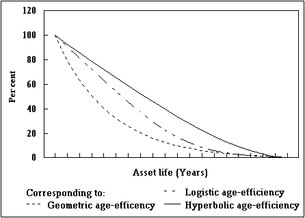 16.19 There is a lack of empirical data about the shape of age-efficiency functions, and the choice is a matter of judgement. Although capital stock levels are sensitive to the shape of the age-efficiency function, average growth rates are not. (In fact, if real GFCF is held constant over time, the choice would have no impact on the capital stock growth rate, but it would affect the capital stock level.) The ABS has chosen to use hyperbolic functions, the same approach as that used by the US Bureau of Labor Statistics (BLS). That is, the efficiency of the asset declines by small amounts at first and the rate of decline increases as the asset ages.