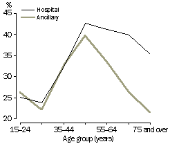 (b) Includes other reasons. (c) Given by those with insurance; more than one reason could be given. Source: Health Insurance Survey, 1998 (ABS cat. no. 4335.0). Characteristics of people insured Over the 1990s, ABS surveys have found that: women are more likely to be covered by private health insurance than men; coverage is highest among the middle-aged; and an increase in the likelihood of being insured is associated with higher income. In addition, people with government health care cards, most of which are means-tested and which make health care more affordable and accessible, are less likely to have some kind of health insurance than others. These factors are interrelated: average incomes are highest among the middle-aged, for example. People on low incomes, the elderly and one-parent families are more likely to be covered by health care cards than are others. In June 1998, 34% of women and 32% of men (aged 15 years and over) were covered by hospital insurance. For ancillary insurance the difference was also slight: 31% of women were covered, compared with 29% of men. The proportion of the population covered by hospital insurance was lowest among those aged 15-24 years (25%) and was highest for those aged 45-54 years (43%). The proportion covered in each age group over 54 years was progressively lower, falling to 35% among those aged 75 years and over. A broadly similar pattern was observed for ancillary insurance, although there was a greater fall-off in coverage in the older age groups for this type of insurance. The proportion of those aged 75 years and over with ancillary insurance (22%) was the lowest of any age group.