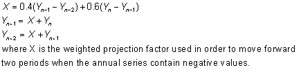 This type of interpolation procedure is designed to calculate quarterly series from annual series by linear trend interpolation; the annual series are projected backwards by one period and forwards by two periods using a weighted average of the rate of increase prior to calculation of the quarterly values (the forward projection gives quarterly estimates for the current year).