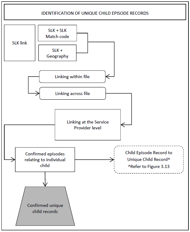 The conceptual decision about whether episodes relate to a child was completed through two main processes. The first was linking on SLK plus SLK Match Code or SLK plus geography, the second occurs after linking within a service provider.