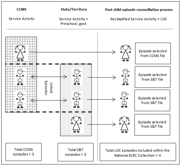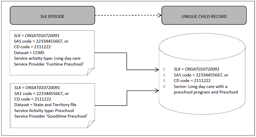 SECTOR CLASSIFICATION FOR THE NATIONAL EARLY CHILDHOOD EDUCATION AND CARE COLLECTION Figure 4.1 Sector Classifications Management type is not disaggregated within the long day care (LDC) classification due to data availability issues associated with the Child Care Management System (CCMS). A data quality statement for the CCMS can be found in Chapter 6: Jurisdictional Data Quality Statements – Australian Government. The child classification category ‘Long day care with a preschool program and Preschool’ within the sector classification is derived by the ABS. The example outlined in figure 4.2 shows how a child may be enrolled in both ‘preschool’ and ‘long day care’. In this scenario, unique child records would be presented under the sector classification ‘Long day care with a preschool program and Preschool’. Figure 4.2: Derived ‘Sector Classification’ from two episodes Derived Sector Classification In 2011, as part of the National Early Childhood Education and Care, Preschool Provider Frame project, the ABS created a comprehensive frame of all service providers with a preschool service. A summary of the 2011 ECEC provider frame was presented at Table A2 of the Experimental Estimates of Preschool Education, Australia, 2011 (cat. no 4240.0). In 2012, the ABS continued developing the ECEC provider frame through utilising existing infrastructure that supports the broader National Early Childhood Education and Care Collection. This infrastructure facilitates the merging of multiple sources of service provider information to identify unique service providers delivering ECEC services in Australia. The example presented in Figure 4.3 shows how the same service provider may be reported by a state and territory collection as well as the CCMS. A state or territory may report a state/territory funded ‘preschool’ at a particular location. At the same centre, a long day care program may also operate with enrolled children receiving a preschool program within both preschool and child care components (by definition of the National Early Childhood Education and Care Collection). In this example, a child may be reported by both a state or territory and the CCMS. While the management types for the two programs may be different (i.e. a government preschool and a community LDC), the two programs operate from the same service provider. In these scenarios, the ABS has reclassified the service provider activity type as ‘LDC with preschool’ to best reflect the nature of activities delivered by these service providers, within the current framework of the National ECEC Collection Standards. Methodological Implications on the New Derived Service Provider Classification Service Providers The change in methodology to the 2012 National ECEC Collection will result in the movement of service provider records across service activity type categories. This has a potentially significant impact on service activity output with an increase in ‘long day care delivering a preschool’ and a decrease in preschools. This change in collection methodology will have no impact to states and territories where there is no service provider overlap in 2012 with CCMS and their collections. Child Episode Records The 2012 National ECEC Collection utilised as many available episode records attached to a service provider as possible, irrespective of data source. Figure 4.4 below shows how child episodes are utilised in the new collection methodology to increase the accuracy of the number of episodes for inclusion. Figure 4.3: Child Episode reconciliation from multiple data sources for a single service provider In-scope episodes used in output populations include a combination of state and territory-only, CCMS-only and overlapping state and territory and CCMS records. Of the overlapping episode records, only one episode (always from a state and territory collection) is chosen is chosen if they are for the same child at the same service provider. Figure 4.4: Service provider determination from ABS Provider Frame and associated child episodes Based on this methodology, episode and child level data presented can be sourced from state and territory-only episodes and/or CCMS-only episodes as well as the overlapping episodes. Child Episode to unique Child Record and Year Before Fulltime Schooling Within collection output tables, users can expect movements between children enrolled / attending ‘preschool’ and ‘long day care’ categories as well as movements between children enrolled / attending ‘long day care with a preschool’ and ‘long day care with a preschool and Preschool’. Child Episode reconciliation from multiple data sources Figure 4.4 depicts how the change in 2012 collection methodology impacts on child episodes. In this example, the state and territory-sourced “Funtime Early Learning Centre” and CCMS-sourced “Funtime Long Day Care Centre” at the same location have been linked within the National ECEC Collection processes. The derived sector classification methodology has been applied and the service provider has been classified as a ‘Long Day Care’ centre. All child episodes attached to each collection source (CCMS or state and territory) for a linked service provider (eg “Funtime Early Learning Centre” and “Funtime Long Day Care”) now share the same service provider characteristics (management type and service activity type). For all child episodes within a service provider having linked episodes in both a state or territory and CCMS files, only state and territory sourced episodes will be utilised. All episodes within a service provider are utilised for child episodes sourced only from a state and territory file or CCMS. All child episodes from either input file are now classified as Long Day Care and will be counted as episodes of Long Day Care in ABS publication tables. Sector Classification Reporting As a result of data processing methods for the National ECEC Collecti