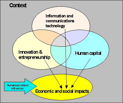 A simplified diagrammatic representation of the dimension structure of the Framework is presented below. It shows the Context dimension as being pervasive, the three core dimensions as overlapping and the Economic and social impacts dimension as being affected by both the Context and the three core dimensions. In reality, there are many more relationships than those shown.