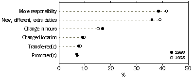 In 1998, women were more likely than men to have experienced new, different or extra duties (38% of women compared with 34% of men) or a change in hours (20% of women compared with 15% of men). This could be associated with women changing from full-time to part-time positions or vice versa to accommodate child care needs and experiencing changes to the content of jobs as a result. In keeping with this, a change in hours was more commonly experienced by women with children under 6 years (27%) than by women overall.