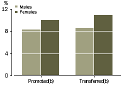 As discussed earlier, full-time permanent employees were more likely than other employees to have been promoted or transferred in the previous year. Within this group, women were more likely than men to have been promoted (10% compared with 8%) and transferred (11% compared with 9%). However, because women were less likely than men to have been employed on a full-time permanent basis (56% compared with 83%), the overall proportion of women promoted and transferred was similar to that of men.