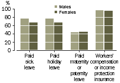 (b) Those whose preference was not known have been included in the population estimate total column but have been excluded from the calculation of percentage distributions. (c) Includes those who indicated no preference. Source: ABS 2000 Survey of Employment Arrangements and Superannuation. In 2000, the single most common main reason for employees wanting to work fewer hours in their main job was to have more free time to engage in social or recreational activities. Of employees who preferred to work more hours, desire for more income was the main reason for 93%. Very small proportions preferred to work more hours mainly to gain more experience or meet career goals (3%), to get work done or to meet a workload (2%), or for some other reason (3%). In 2000, employees working a set number of days over a given period of time were more likely than employees working shiftwork, casual or relief work to be working their preferred pattern of hours. This difference prevailed among both male and female employees. For example, 76% of male employees and 79% of female employees working a set number of days each week were working their preferred pattern of hours. In comparison, only 47% and 52% respectively of male and female employees doing casual or relief work were working their preferred pattern. PROPORTION OF EMPLOYEES WHO PREFERRED THEIR CURRENT PATTERN OF WORK HOURS(a) - 2000 (a) ln the main job of people who are an employee in their main job. Source: ABS 2000 Survey of Employment Arrangements and Superannuation. Entitlements Over recent decades, some employers and employees have expressed a desire for change that embraces more diverse, more flexible, and more 'family-friendly' working arrangements. Wider access to maternity leave, paternity leave, parental leave, and carer’s leave are examples of such desired change, which is likely to have been influenced in part by increasing workforce participation of women during this period of time. In 2000, nearly half of all female employees (45%) were entitled to some paid maternity leave. A similar proportion of male employees (44%) had an entitlement to some paid paternity leave. Higher proportions of both male and female employees were entitled to paid sick leave, and to paid holiday leave, and almost all employees were covered by either workers' compensation or income protection insurance. PROPORTION OF EMPLOYEES WITH SELECTED ENTITLEMENTS(a)(b) - 2000 (a) ln the main job of people who are an employee in their main job. (b) Those who did not know if they had a particular entitlement were excluded prior to the calculation of that proportion. Source: ABS 2000 Survey of Employment Arrangements and Superannuation. Continuity of employment Confidence about having ongoing paid employment may influence people's decisions about, and ability to undertake, long-term commitments such as raising children, entering into mortgages, and borrowing to invest or to purchase assets such as cars, furniture and appliances. A move away from permanent employment towards contract employment, which promises a job for only a specified period of time, and casual employment, in which there is not necessarily an expectation of continuing employment, could generate concern among some people about diminishing job security. In 2000, 3% of employees with leave entitlements expected to leave their job within a year because of economic or work-related reasons (including the ending of a fixed-term contract). The proportion was higher among employees who considered themselves to be employed on a casual basis, with 7% expecting to leave their job within a year for these reasons. Also in 2000, 5% of people who worked as an employee in their main job were employed on a fixed-term contract basis. The majority of these people did not expect to have to leave their job when their contract ended, with 72% expecting their contract to be renewed. SELECTED CHARACTERISTICS OF THE MAIN JOB OF EMPLOYEES(a) - 2000