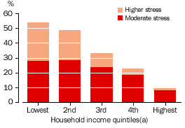In 1998-99, the proportions of households experiencing higher stress (i.e. reporting five or more stress indicators) were much higher for households in the lower income quintiles. In the two lowest household income quintiles 26% and 21% experienced higher levels of financial stress, respectively. This dropped to 10% in the third income quintile. Almost no households in the highest income quintile had higher levels of financial stress. Further, comparatively high proportions of households with low incomes reported the more severe financial stress indicators, compared with those households with higher incomes. These indicators included pawning or selling something (reported by 9% of households in the lowest quintile), seeking assistance from welfare or community organisations (8%), going without meals (5%), and not being able to heat the home (5%). For households with higher incomes (i.e. the highest three income quintiles combined), 2% or less reported these stress indicators.