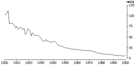 Source: Deaths, Australia, 2000 (ABS Cat. no. 3302.0). Between 1980 and 2000, the infant mortality rate for Australia decreased by 51%, from 10.7 to 5.2 deaths per 1,000 live births. Decreases varied across States and Territories with Western Australia and Victoria experiencing the greatest declines over the period - 63% and 55% to 4.3 and 4.5 deaths per 1,000 live births respectively in 2000. While infant mortality rates in Tasmania and the Australian Capital Territory have decreased in line with the national trend, they have shown more variability from year to year due to the small numbers of infant deaths.