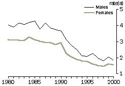 Source: ABS Causes of Death collection. Over the last decade of the 20th century, the neonatal death rate from conditions originating in the perinatal period declined by 26%, from 3.1 deaths per 1,000 live births in 1987-1990 to 2.3 deaths per 1,000 live births in 1997-2000. In 1997-2000, 56% of neonatal deaths from conditions originating in the perinatal period were due to maternal factors and complications of pregnancy, labour and delivery (36% of all neonatal deaths). Because of changes in the classification of causes of death, a comparable figure is not available for 1987-1990. The two other common types of conditions originating in the perinatal period were hypoxia, birth asphyxia and other respiratory conditions (accounting for 12% of neonatal deaths in 1997-2000), and disorders relating to length of gestation and fetal growth (accounting for 4% of deaths). Both types of conditions made up a greater proportion of neonatal deaths a decade earlier (27% and 19% respectively in 1987-1990). Over the same period, there was a slight increase in the proportion of deaths from conditions which originate in the perinatal period which were not identified. Between 1987-1990 and 1997-2000, the neonatal death rate for congenital malformations declined from 1.6 to 1.1 deaths per 1,000 live births, partly due to improved screening methods to detect such conditions (including amniocentesis and ultrasound) and greater awareness of preventative measures during pregnancy. NEONATAL MORTALITY RATE(a) (a) Rate per 1,000 live births. Source: ABS Causes of Death collection. Postneonatal mortality Between 1980 and 2000, the mortality rate for babies aged 28 days and under one year declined by 53% from 3.6 to 1.7 deaths per 1,000 live births. The rate of decline was similar for boys and girls. Babies who die after the first 28 days of life were likely to die from a greater range of causes than those who die in their first four weeks of life. Congenital malformations and conditions originating in the perinatal period were again among the more common causes of postneonatal deaths, accounting for 21% and 12% of deaths respectively in 1997-2000. However, the most commonly cited group of causes were symptoms, signs and abnormal clinical and laboratory findings not elsewhere classified. This group of causes accounted for a third of postneonatal deaths in 1997-2000, the bulk of them (30% of all postneonatal deaths) caused by Sudden Infant Death Syndrome (SIDS).