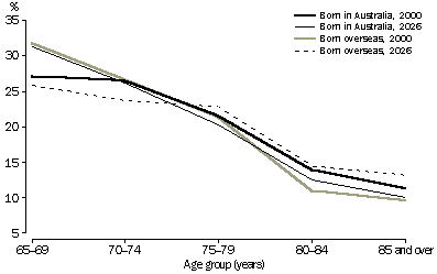 Age and sex structure In 2000, Australia’s overseas-born population had a higher proportion of older people than the Australian-born population (17% compared with 11%). However, within the older population, the age structure of the overseas-born was younger than that of the Australian-born, with a higher proportion aged 65-69 years and a lower proportion aged 85 years and over. This is because many of the overseas-born aged 85 years and over in 2000 arrived prior to 1951, when migration numbers were low. Women formed a relatively low proportion of the older overseas-born population (52% compared with 58% for the older Australian-born population). There are two main reasons for this - the lower proportion of older overseas-born Australians aged 85 years and over (10% compared with 11% for the older Australian-born population), a group dominated by women because of their longer life expectancy; and the high proportion of men among post-war migrants. AGE STRUCTURES OF OLDER AUSTRALIANS Source: Migration, Australia, 1999-2000 (ABS cat. no. 3412.0) ; Gibson, D., Braun, P., Benham, C. and Mason, F. 2001, Projections of Older Immigrants: people from culturally and linguistically diverse backgrounds, 1996-2026, Australia. AIHW cat. no. 18., AIHW, Canberra. While the number of older overseas-born Australians in each age group is projected to grow considerably by 2026, more rapid growth is expected among those aged 80 years and over. So, for example, the proportion of older overseas-born Australians aged 85 years and over is likely to increase from 10% in 2000 to 13% in 2026, while the proportion aged 65-69 years is likely to decrease from 32% to 26%. This ageing is largely because many migrants who arrived during the peak period of immigration to Australia (from the late 1960s to the early 1970s) and who were approaching 65 years of age in 2000, will be aged 85 years and over by 2026. To a lesser extent, this ageing is due to the impact of excluding migration from the projections, since the 'younger' age groups (65-74 years) are smaller in 2026 than if migration was included. In contrast, the age structure of the older Australian-born population is projected to become younger by 2026. The higher proportion of this population aged 65-69 years (31%, compared with 27% in 2000) will result from the last of the post-war baby-boomers entering this age group. OLDER OVERSEAS-BORN AUSTRALIANS - PRESENT AND FUTURE