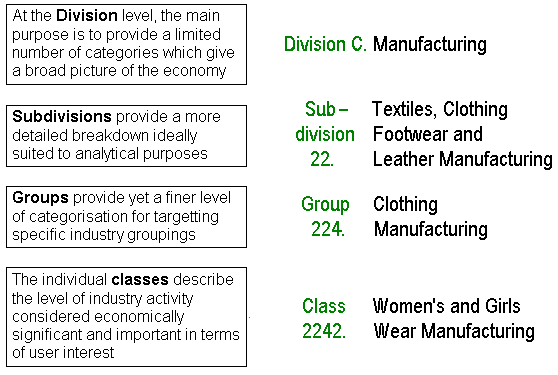 The ANSZIC structure comprises four levels: Divisions (the broadest level), Subdivisions, Groups and Classes (the finest level). At the Divisional level the main purpose is to provide a limited number of categories presenting a broad overall picture of the economy and suitable for publication in summary tables in official statistics. The Subdivision, Group and Class levels provide increasingly detailed dissections of the broad categories.