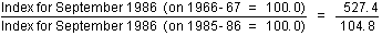 16.19. For periods following a change in reference base, index numbers on the former basis can still be derived from index numbers on the new basis using arithmetic conversion factors derived from the relationships between the old and new series at the time of the change. For example, from the October 1986 issue onwards, the House Building index was converted to a reference base of 1985-86 = 100.0 from the previous reference base of 1966-67 = 100.0. The factor for Sydney to be used to convert from the new basis to the old was derived as: