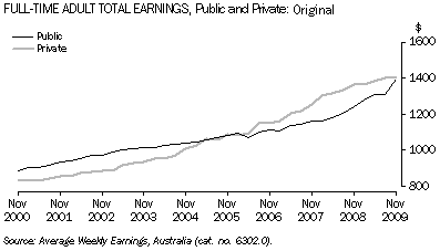 - In original terms, average weekly total earnings for full-time adults have been higher for private sector than public sector workers since the May quarter 2006, a reversal of the previous 10 years when public sector earnings were consistently higher than private sector earnings. However, after the difference in sector earnings reached a peak of $138 per week in the February quarter 2008, the gap has since closed, with the difference only $13 per week as of the November quarter 2009.