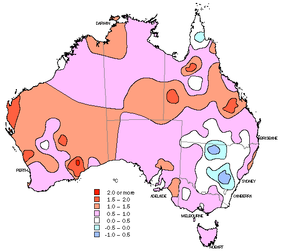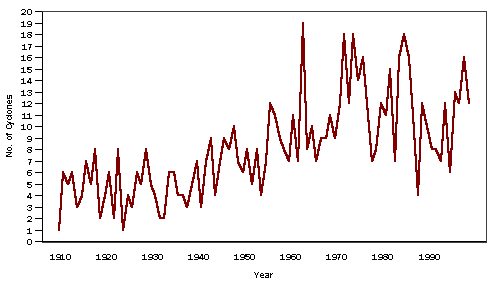 C2.9 The distribution of annual rainfall over Australia in the period 1901 to 1999, by decade. Areas coloured green fall in the upper tercile (i.e. wet) for the decade concerned, while the brown areas fall in the lower tercile (dry). Temperature The history of annual mean temperature over Australia through most of the twentieth century is shown in graph C2.10. C2.10 Areal average temperature anomalies (°C) over Australia relative to the 1961-90 normals for the period 1910-99. The overall warming trend during the second half of the century evident in graph C2.10 is much more strongly evident in minimum temperatures than in maximum temperatures and it is not uniform over the continent. In fact, some parts of NSW and northern Queensland experienced a slight cooling trend over the century as a whole, as shown in map C2.11. C2.11 The trend in annual mean temperature over Australia for the period 1910-99 in °C per century. Tropical cyclones Although a number may have gone undetected in the early years and the apparent increase in frequency in the middle part of the century may not be real, it appears that some 800-1,000 tropical cyclones have developed in the Australian region (105-165°E) during the twentieth century, with as few as one and as many as nineteen in a single season (graph C2.12). Map C2.13 shows their tracks for the ten year period 1970-80. C2.12 The annual occurrences of tropical cyclones in the Australian region (105-165°E) from July 1909 to June 2000. C2.13 Tropical cyclone tracks in the Australian region, 1970-80. The loss of life from tropical cyclones was greatest in the early part of the century, with several infamous cyclones of the early years striking almost without warning. Among the best known are the Broome cyclone of 1908 (loss of 50 lives), the Mackay cyclone of 1918, the Darwin cyclone of 1939, Cyclone Ada (which struck the Whitsunday Islands in January 1970 with a loss of 13 lives), Cyclone Tracy in 1974 and Cyclone Vance (which produced the strongest measured wind gust on mainland Australia (267 km/h) as it passed close to Exmouth, Western Australia, on 22 March 1999). Floods The twentieth century witnessed many disastrous floods including both flash floods and riverine floods along the eastern, western and northern coasts as well as in the westward and southwest flowing rivers of the Murray Darling system. Six years: 1954, 55, 56, 59, 71 and 74, stand out as the major flood years of the century, with the Hunter floods of February 1955 and the Brisbane flood of January 1974 perhaps the worst. Other notable floods included the Todd River flood at Alice Springs in March 1910, the Latrobe River flood in Victoria in December 1934, the Charleville flood of April 1990, the North eastern Victorian floods of October 1993 and the Katherine (NT) flood of January 1998. Droughts The great Australian droughts of the twentieth century have mostly been closely linked with the major swings in the Southern Oscillation Index (SOI) (graph C2.6), with drought in eastern Australia coinciding with the El Niño (warm central and eastern Pacific ocean) phase of the El Niño-La Niña cycle. The major drought years included: