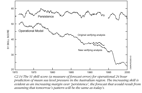 A century of progress in science and service The science and practice of meteorology have made enormous progress through the twentieth century, with very large benefits flowing to all nations, but especially to Australia, from the unique system of international cooperation in the collection and exchange of data and products and through a series of globally coordinated research programs aimed at improved understanding and prediction of weather and climate. The development of Australian meteorology is documented in such publications as Crowder (1995), Webb (1997) and the various annual and research reports of the Bureau and CSIRO. There has been great progress in several areas. Observing the structure and behaviour of the atmosphere Australian meteorology in the twentieth century was magnificently served by a tradition of excellence in observational practices and high quality climate records inherited from its pioneers, but these were all simple measurements of quantities such as temperature, wind and rainfall or visual observations of weather, visibility and cloud. After early experiments with balloons and aircraft, a comprehensive upper air (rawinsonde) network for the measurement of temperature, humidity and wind speed up to 25km or more was progressively established from the mid 1940s onwards, and there are now 50 such stations, some automated. At the same time many surface observating stations have been replaced by automatic weather stations to provide information for both day to day weather forecasting and the long term national climate record. These are complemented by many thousands of volunteer observers whose outstanding contribution to Australian meteorology is celebrated this year, the United Nations Year of Volunteers. Radar and satellite meteorology Two major developments during the twentieth century greatly enhanced the capability for studying the three dimensional structure of the atmosphere and monitoring individual weather systems. Weather radars were introduced into Australia during the 1950s and 60s and have revolutionised the detection and tracking of severe weather systems, including the tropical cyclones that threaten the northern coastline. The Australian weather radar network now consists of some 50 stations covering the capital cities and most of the tropical coastline. The launch of the first weather satellites in the early 1960s and the special arrangements put in place for accessing their data enabled meteorologists for the first time to reliably track the major southern ocean synoptic systems which largely determine the weather across the southern States. By the close of the century, international weather satellites were providing continuous hour by hour monitoring of weather patterns over the entire Australian region as well as detailed vertical profiles of temperature and wind to complement and integrate the data from the surface-based rawinsonde network. Numerical weather prediction Following the establishment of the World Weather Watch in 1964, and the Australian commitment to operating one of the three World Meteorological Centres, Australian meteorologists moved quickly to develop a world class research effort in the then emerging field of numerical weather prediction. Research carried out in the Australian Numerical Meteorology Research Centre (ANMRC), and subsequently the Bureau of Meteorology Research Centre (BMRC) in close collaboration with overseas research centres, has enabled the Bureau, with the aid of powerful computers first installed in 1968 and progressively upgraded in line with the international state of the art, to operate global, regional and local numerical weather prediction models providing skilful guidance to weather forecasters throughout Australia and its neighbouring countries. The steady increase in skill since the first introduction of numerical prediction models into the operations of the Bureau in the early 1970s is shown in graph C2.14. Modelling of climate Essentially the same models used for numerical weather prediction have, over the past twenty-five years, been progressively converted into climate simulation models by building in the longer term influence and behaviour of the oceans. Both the Bureau and CSIRO now operate sophisticated atmosphere-ocean general circulation models capable of simulating the behaviour of the global climate system - for use both in predicting the natural (El Niño and related) fluctuations of Australian climate on time scales of months to years and projecting future patterns of greenhouse-induced climate change over Australia under various greenhouse gas emission scenarios. Although these models have demonstrated significant skill for seasonal to interannual prediction, there is, so far, little confidence in their ability to provide reliable guidance on greenhouse time scales beyond indicating a general warming trend over the continent during the twenty-first century, with more warming in the interior than near the coast. Service to the community Meteorology is one of the most scientifically challenging but also most practically useful fields of science there is. The observing, data collection and modelling work of the Bureau provides the basis for a wide range of services to the Australian community at large and to most major economic sectors including agriculture, transport, energy and the information industries. Although limited in scope and accuracy in the early part of the century, the Bureau’s forecasts have steadily increased in lead time, skill and utility and now provide the basis for many millions of important weather and climate sensitive decisions every day. Economic valuation studies suggest that the overall benefit to the Australian community from the services of the Bureau at the close of the twentieth century exceed their cost by at least an order of magnitude. The continuing progress in national and international meteorological science and technology suggests the opportunity 