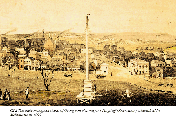 INTRODUCTION Australia’s weather and climate inspired the dreamtime legends of its first inhabitants and shaped its development as an infant nation. The violent thunder squalls which greeted the First Fleet as they rounded Van Dieman’s Land provided a foretaste of worse to come, and the shipwrecks which soon littered the southern coastline reminded recent arrivals from Europe, if reminder were needed, of the ferocity of the storms which swept in without warning from the southern ocean. The extremely dry conditions in the early years at Sydney Cove (Tench 1789; Nicholls 1988) exacerbated the trauma of the starvation years (Hughes 1987). And the nineteenth century manifestations of what we now know as El Niño and the Southern Oscillation soon brought the droughts and flooding rains that wrought great hardship on the early settlers and established, in prose and verse, the enduring images of the Australian bush. Meteorology has a proud place in the early life of the colonies and the birth of the Federation. Australia’s meteorological pioneers established observing networks throughout the length and breadth of the continent, and collected the data needed to map the climate of the interior and develop a scientific basis for forecasting of events as diverse as the southerly busters of the NSW coast and the monsoon rains and cyclones of the tropical north. Nothing mattered quite so much in the preparations for the opening of the first Federal Parliament in Melbourne as the timing of the arrival of the deep depression which threatened to add fierce wintery squalls and driving rain to the pageantry of the occasion. That Parliament was subsequently to put in place the legislation which led to the establishment of the Commonwealth Bureau of Meteorology by bringing together the separate colonial/State Meteorological Services that had existed up to that time, in an arrangement which has provided Australia with one of the most effective national meteorological service systems in the world. The remarkable advances that have occurred in the science and practice of meteorology through the twentieth century have greatly reduced the toll of natural disasters and brought enormous benefits to virtually all walks of life. They have laid the foundation for even greater benefits from meteorological science and services in the twenty-first century. The origins of Australian meteorology Meteorology, along with astronomy, is one of the oldest sciences we have. Although the systematic study of Australia’s weather and climate began with the arrival of the First Fleet in January 1788, the origins of Australian meteorology go back long before the time of European settlement to the observations, belief systems and lifestyle of the Aborigines who, over a period of 40,000 years or more, had witnessed the retreat of the last ice age and learned to live with the rhythm of the seasons and the extremes of weather and climate. In the beginning All the weather and climate phenomena we know today played a part in the lives of the early inhabitants of the Australian continent. But in different parts of Australia there were different names and different explanations for the various atmospheric forces - thunder, lightning, rainbows, clouds and winds - and the march of the seasons. The peoples of Arnhem Land defined the seasons in terms of the ‘balmarrk wana’ or ‘big winds’ with the wet season brought on by barra the north-west monsoon (Jones and Meehan 1997). The Aboriginal people of central Australia developed a very different understanding of the seasons, and their influence on the land and its animals and plants. Further south in Tasmania, they had learned to recognise the signs of changing weather and to make use of fire for protection against the cold. Much of the modern understanding of the Aboriginal interpretation of weather and climate in various parts of Australia has been captured in a series of writings and paintings by anthropologist Charles P. Mountford, and artist Ainslie Roberts (figure C2.1). Australia’s meteorological pioneers The foundations of Australia’s meteorological records were laid at Sydney Cove by Lieutenant William Dawes who built a small observatory there and commenced regular observations in September 1788 (McAfee 1978). While participating fully in local exploration and other aspects of the early life of the colony, Dawes maintained his observations with great dedication, often making readings up to six times per day, through until December 1791, shortly before he returned prematurely to England, having incurred the displeasure of the Governor for his refusal to participate in reprisal raids against the Aborigines. Following Dawes’ departure, the systematic collection of meteorological observations in the colony lapsed until the arrival of the soldier-scientist, Sir Thomas Brisbane, as Governor. He established an observatory at Parramatta where records were maintained from 1822 until 1826. The next systematic series of observations in the Sydney area was begun in 1832 by Commander Phillip Parker King, who had already, in 1822, published the first description of Australian climate in On the maritime geography of Australia. These were maintained through only until 1848. However, in 1858 continuous observations recommenced at the newly constructed Sydney Observatory on what is now known as Observatory Hill. Meteorological observations were also commenced at other locations in New South Wales, including at Port Macquarie (1840), and in Adelaide (1839), Brisbane (1840), Hobart (1841), Melbourne (1856) and Perth (1876). The first thorough study of the Australian climate was published in 1859 by William Stanley Jevons, a gold assayer at the Sydney Branch of the Royal Mint who was subsequently to make major contributions in the fields of logic, statistics and economics and who has been variously described as Australia’s first social scientist and “one of the greatest Englishmen of 