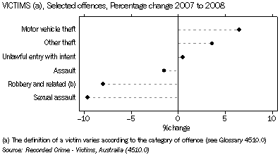 - In 2008, the number of victims recorded by police increased for motor vehicle theft, other theft and unlawful entry with intent.