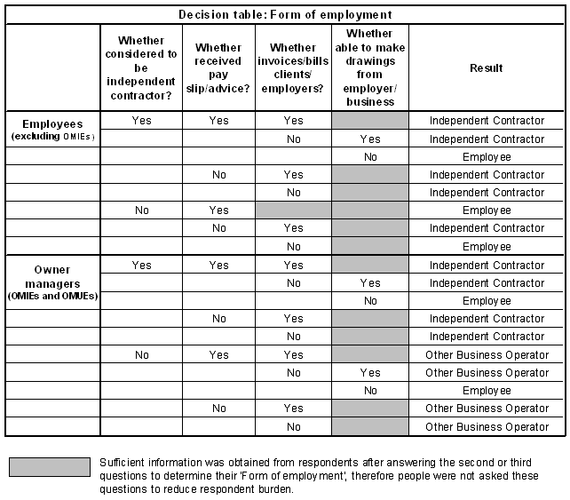 The following decision table shows how people are classified in the 'Form of employment' data item.