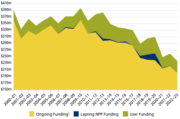 Future efficiencies will be dependent on changes in the way the ABS collects information, such as further use of administrative data, more e-form collection, and the efficiency with which we compile and analyse this information, such as more automation of coding and editing. CHART 1: Real ABS operating funding1, 2000-01 to 2022-23 Notes: