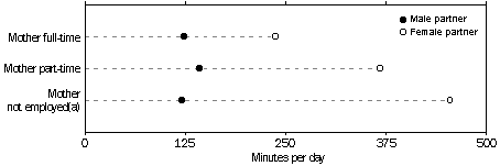 Parents provide care for their children in various ways, often just passively minding them while they are attending to other activities such as cooking or cleaning - or just relaxing. However, they also spend time actively looking after the personal needs of their children, such as feeding, cuddling, reading or talking to their children, as well as some time on extra tasks such as organising their daily activities. The extent to which mothers and fathers share their time in attending to various child care activities can be demonstrated by focusing on parents with similar work commitments - for example, where both parents are employed full-time.