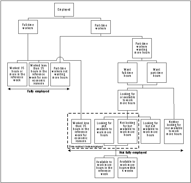 5.9 Fully employed workers comprise: employed persons who worked full-time during the reference week (includes persons who usually work part-time); employed persons who usually work full-time but worked part-time in the reference week for non-economic (footnote 2) reasons; and part-time workers (usually work part-time and did so in the reference week (footnote 3)) who do not want to work additional hours. Full-time workers who worked part-time in the reference week for non-economic reasons are considered to be fully employed because they usually work full-time, and worked part-time in the reference week voluntarily. 5.10 Persons who are not fully employed comprise: part-time workers (usually work part-time and did so in the reference week) who want to work more hours; and full-time workers who worked part-time in the reference week for economic reasons. Time-related underemployed workers (as defined in the ILO guidelines) are a subgroup of persons 'not fully employed'. 5.11 The ABS underemployment framework further classifies persons who are not fully employed according to whether they were looking for and/or available to start work with more hours, and according to the number of additional hours sought. The framework identifies: persons wanting full-time hours; persons wanting more part-time hours; persons who looked for extra work during the four weeks prior to the survey; and persons who were available to start extra work (either in the reference week or in the four weeks subsequent to the survey). It is assumed that full-time workers who worked part-time in the reference week for economic reasons wanted to work full-time in the reference week and would have been available to do so. The ABS underemployment framework is set out in diagram 5.3. 5.3 ABS UNDEREMPLOYMENT FRAMEWORK COMPARISON OF ABS AND INTERNATIONAL DEFINITIONS 5.12 The ABS underemployment framework is consistent with the ILO concept of time-related underemployment, although the international standards do not specifically identify the group 'fully employed workers' as is the case in the ABS framework. Worked less than a threshold relating to working time 5.13 The international definition of time-related underemployment includes a threshold relating to working time. Only persons actually working less than the threshold should be included in statistics of time-related underemployment. The international standards do not specify the threshold to be used. Instead they suggest a number of alternative approaches which may be suitable. 5.14 The threshold used in the ABS underemployment framework is based on the boundary between full-time and part-time work. Only those employed persons actually working less than 35 hours in the reference week may be further classified as not fully employed. Persons actually working less than 35 hours in the reference week include part-time workers (persons who usually work part-time and did so in the reference week), as well as some full-time workers who actually worked part-time hours in the reference week. However, only full-time workers who worked part-time in the reference week for economic reasons are classified as not fully employed in the ABS framework. Those who worked part-time in the reference week for non-economic reasons are assumed to be fully employed, on the basis that they usually work full-time, and that they 'voluntarily' worked part-time in the reference week (see paragraphs 5.8 to 5.10). 5.15 Outlined in paragraph 5.6 is a recommendation contained in the international standards that countries endeavour to identify all workers willing and available to work additional hours, regardless of the hours actually worked during the reference period, i.e. involving relaxation of the threshold relating to working time. The ABS collected some information on employees' preferences for additional hours of work (irrespective of how many hours usually worked) in the 2000 Survey of Employment Arrangements and Superannuation. For further information on the 2000 Survey of Employment Arrangements and Superannuation see Chapter 23. Willingness to work additional hours 5.16 In the ABS framework, willingness to work additional hours is tested by asking part-time workers whether they want to work additional hours. However, additional information on whether respondents have actively looked for additional hours of work is also collected using the same active job search criteria as used for determining unemployment. This information is used to distinguish those who have actively sought to work additional hours from those who have not. This approach is also consistent with the international standards. Availability to work additional hours 5.17 In the ABS framework, availability to work additional hours is determined both in terms of immediate availability (i.e. available in the reference week), and availability within the following four weeks. The international guidelines are not prescriptive on this issue. Volume of time-related underemployment 5.18 As outlined in paragraph 5.6, the international standards state that countries may wish to estimate the volume of time-related underemployment. In the annual Labour Force Survey supplementary topic, Underemployed Workers (see paragraph 5.23), information is collected about usual hours worked and preferred number of extra hours, enabling estimates of the total number of additional hours wanted per week to be compiled. DATA SOURCES 5.19 Estimates of persons not fully employed are available from: