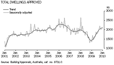 - Residential building approvals continued to rise steadily in January 2010, increasing by 1.0% in trend terms to 2,114, after increases of 1.7% in November and 1.1% in December 2009.