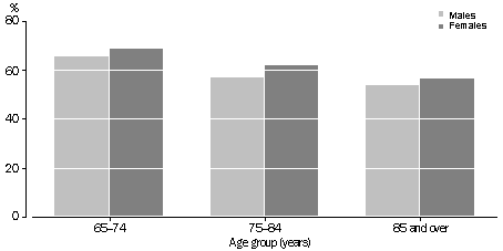 (b) Includes other health actions. People may undertake more than one type of action, therefore components may not add to total. Source: Unpublished data, 1995 National Health Survey. Recent health actions Most older people spend some time taking care of their health, whether it is preventative or on-going care, or attention to a specific health problem. In 1995, more than nine out of ten older people took some type of health-related action in the two weeks prior to the survey. The most common health-related actions taken were the use of medication - excluding vitamins and herbal medicines - (92%), and visiting the doctor (41%). Of all older people, 28% took vitamins or minerals and 13% used natural or herbal medications. Older women were about as likely as older men to visit the doctor or take medication, but more likely to take vitamins or minerals (31%) or natural or herbal medications (15%) than men (25% and 10% respectively). DISABILITY STATUS OF PERSONS AGED 65 AND OVER, 1998
