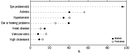 Recent and long-term conditions In 1995, 89% of older people reported experiencing a recent illness, or a recent or recurrent episode of a long-term illness, in the two weeks prior to the survey. Of those who experienced a recent illness only, the most common were fluid problems (11%), headaches (9%), insomnia (9%), dental problems (7%), hypertension (5%) and nerves, tension and nervousness (5%). Most older people (99%) had one or more long-term health conditions. The four most common long-term conditions reported by older people were eye problems - including problems corrected by glasses - (96%), arthritis (49%), hypertension (38%) and ear or hearing problems (32%). However, not all people with these conditions had taken a recent health action for them. For example, very few older people (6% or less) with long-term eye problems and ear or hearing problems had taken a recent health action in relation to these conditions. However, 86% of older people with long-term hypertension had taken some recent action for that condition - commonly medication to keep their blood pressure down. Fewer older people with high cholesterol or arthritis had recent treatment or medication for their condition (44% and 37% respectively). There were some differences over time in the proportions of people with certain health conditions (the combined total of recent and long-term conditions). After allowing for changes in age distribution, there were higher proportions of older people reporting hypertension (41%) and high cholesterol (12%) in 1995, than in 1989-90 (37% and 5% respectively). However, the increase may have been because of factors such as greater public awareness of the importance of regular blood pressure and cholesterol checks to monitor for potential heart disease. There was also a substantial increase in the prevalence of varicose veins in older women (16% compared with 7% in 1989-90). HEALTH RISK FACTORS, FOR PERSONS AGED 65 AND OVER(a), 1989-90 AND 1995