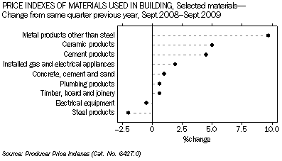 - The price of metal products other than steel (9.7%), ceramic products (5%) and cement products (4.5%) helped drive the overall price increase in building materials in the year to September 2009.