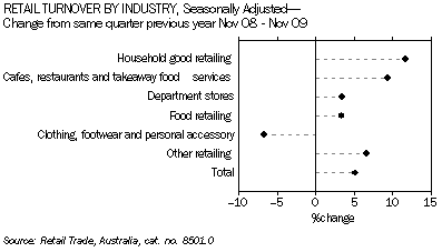- The increase in turnover in the year to September 2009 in seasonally adjusted terms was driven primarily by Household goods (up 12%), Cafes, restaurants and takeaway food services (up 9%). Clothing, footwear and personal accessory retail outlets experienced the only decrease (down 7%).