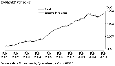 - The total number of employed persons in Western Australia increased in February 2010 by about 3,300 in trend and 6,100 in seasonally adjusted terms. This was the first month in which the total number of employed persons surpassed the previous high of about 1.18 million (trend) in October 2008 before the GFC took effect.