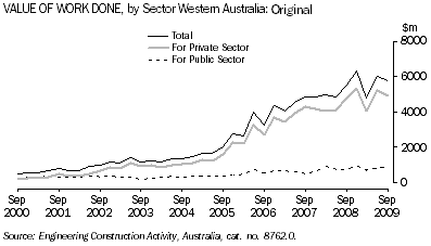 - The seasonally adjusted estimate for the value of total engineering construction work fell to under $6.2 billion (down 2.8%) in the September quarter 2009 after a 25% increase for the June 2009 quarter. However, there was an increase of 5.3% in trend terms for the September quarter.